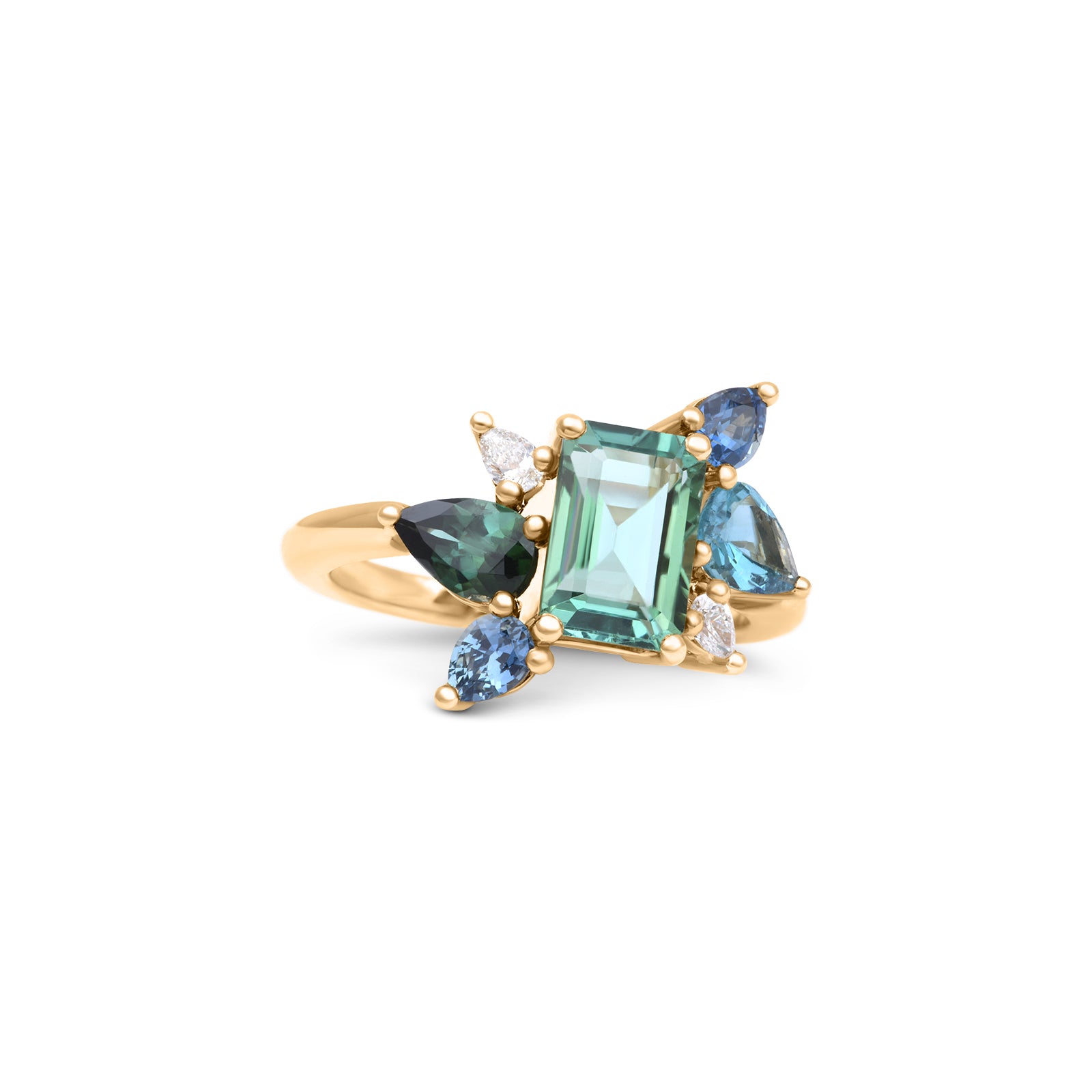 Bague en or jaune 750 recyclé, tourmalines, saphirs et diamants.