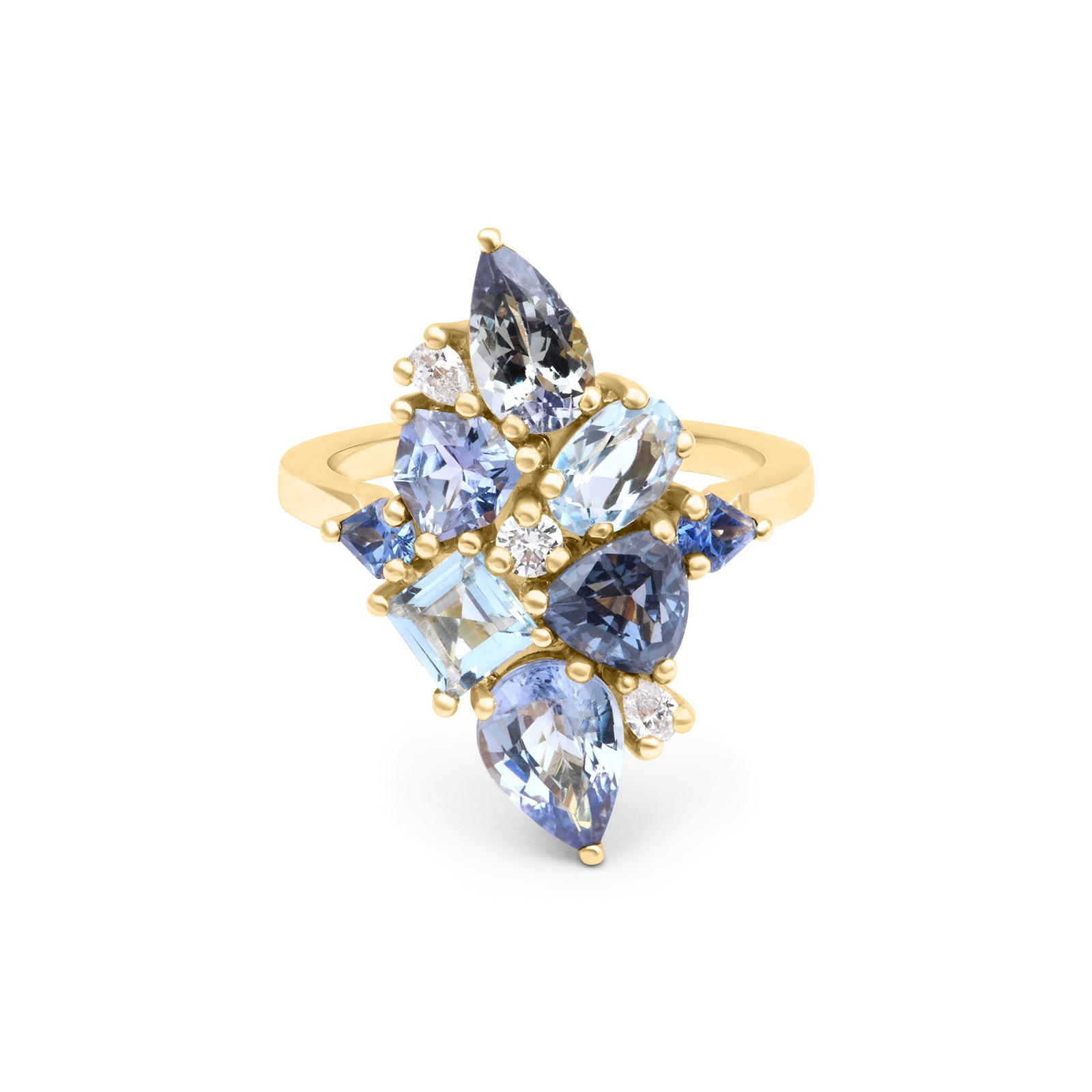 Bague en or jaune 750 recyclé, tanzanites, spienelle, aigues-marine, saphirs et diamants.